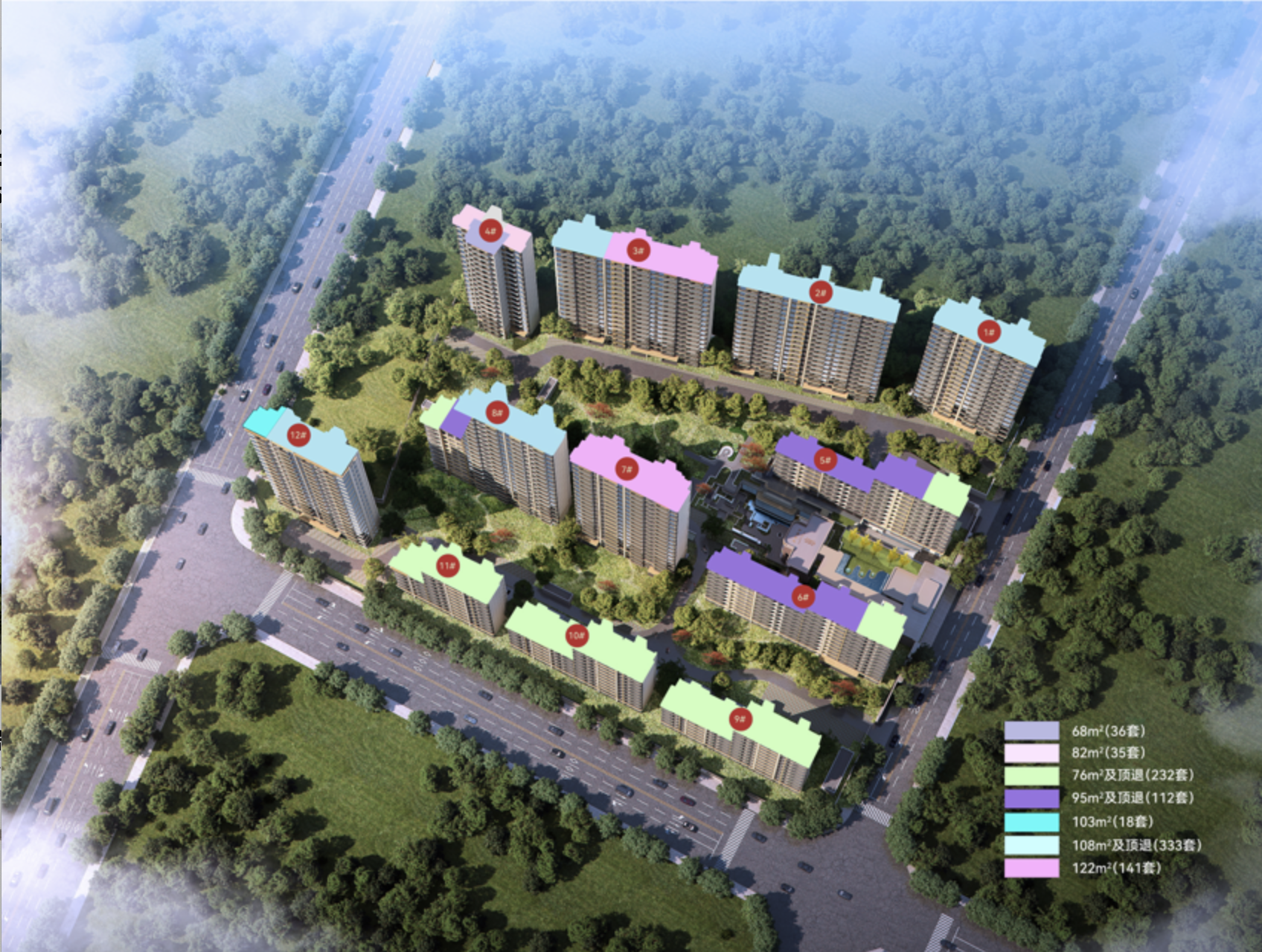 四个主力面积段:78/95/108/122㎡,另有少量68/82/103㎡户型。