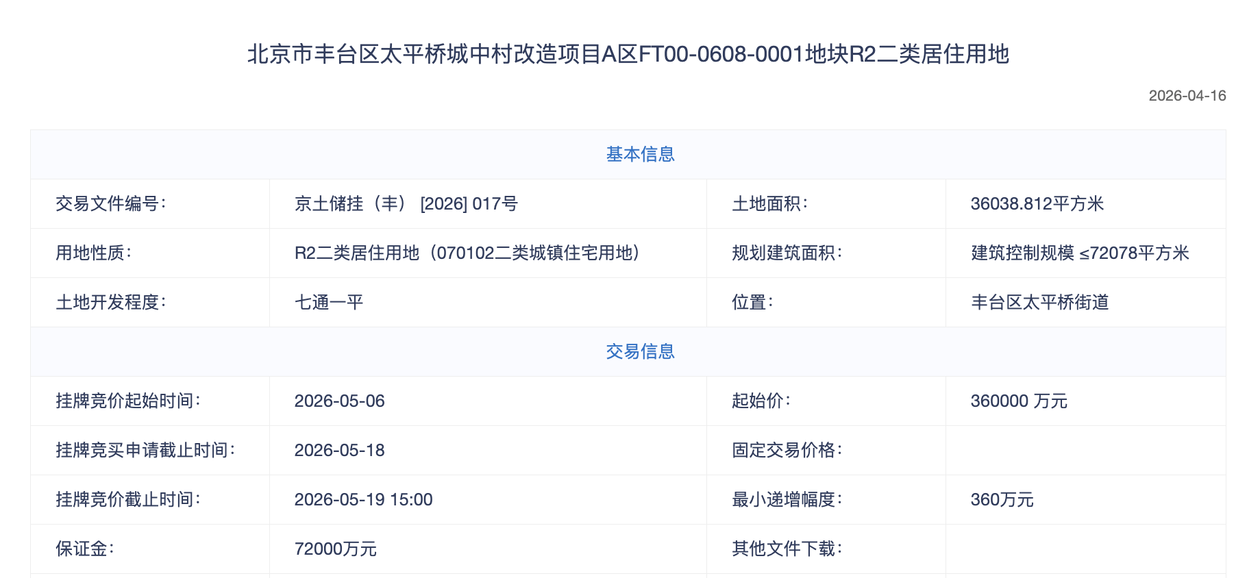 备受关注的太平桥0608-0001地块于4月16日正式挂牌,成为5月北京土拍市场首个亮相的焦点。