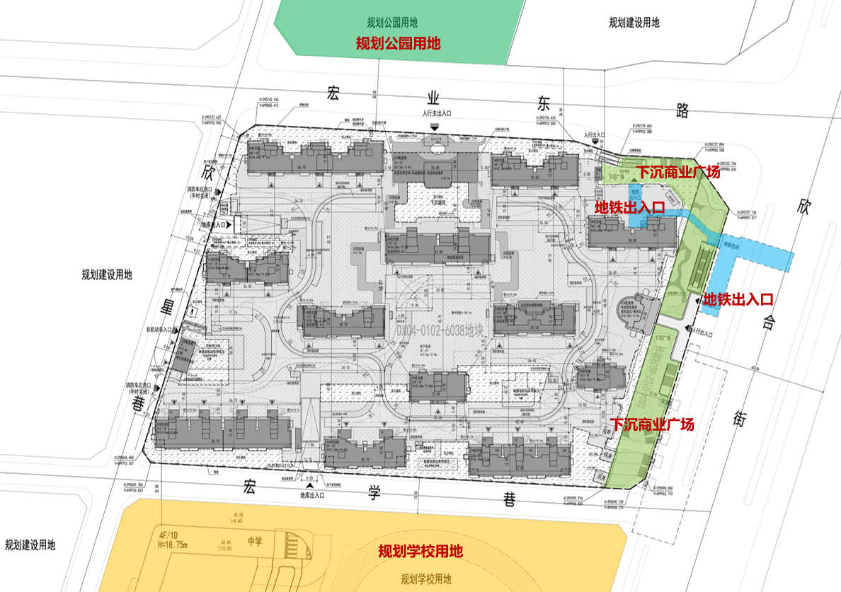 同时,为强化与规划中地铁站点的连接,项目在相邻的6039地块规划了下沉公园,旨在与本地块的下沉商业空间联动,打造一体化的活力商街,并计划在地铁口周边划定约1000㎡的非机动车停车区,系统解决接驳与停车问题。