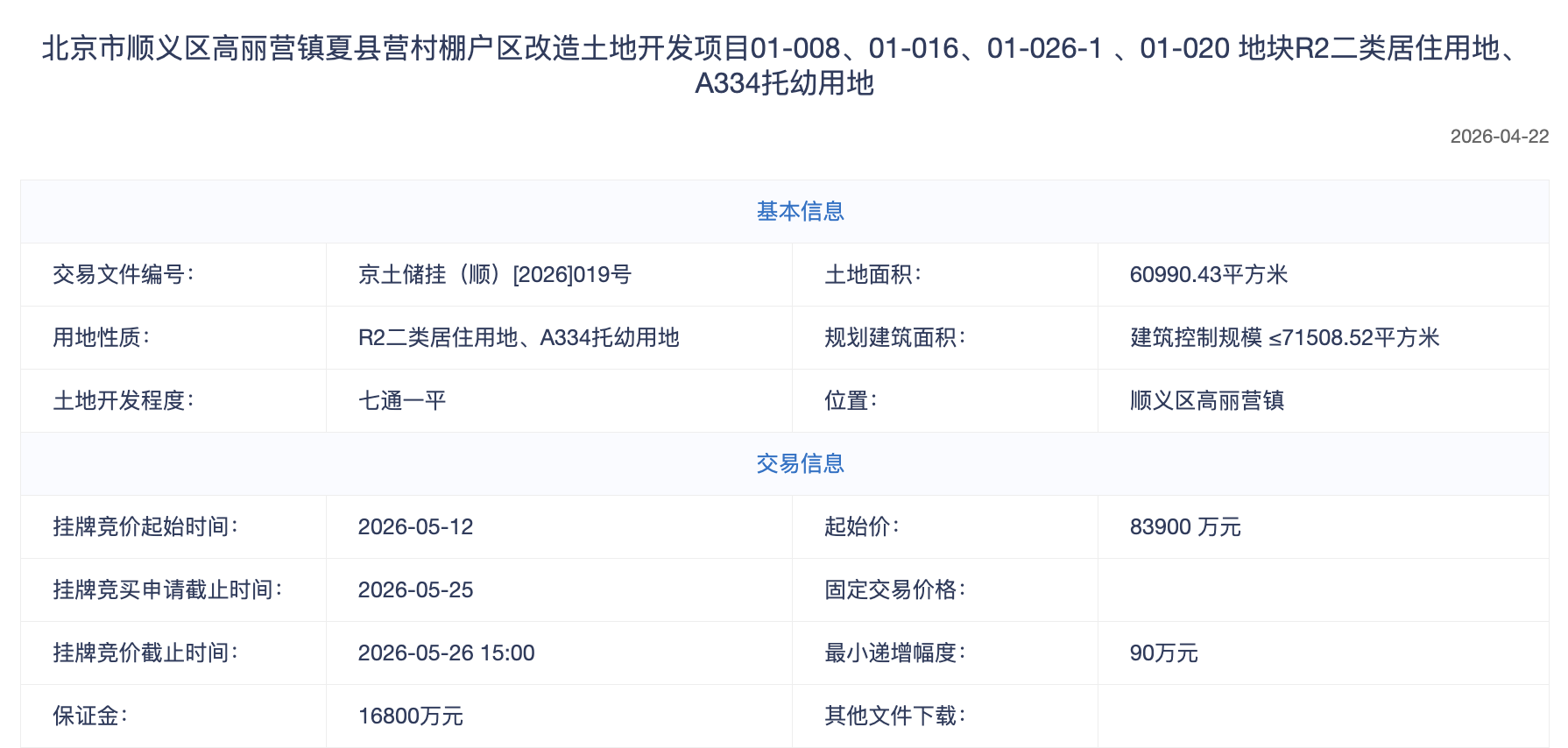 高丽营镇01-008等地块于4月22日正式挂牌,起始总价8.39亿元,折合起始楼面价约1.23万元/平方米,将于5月26日完成出让。