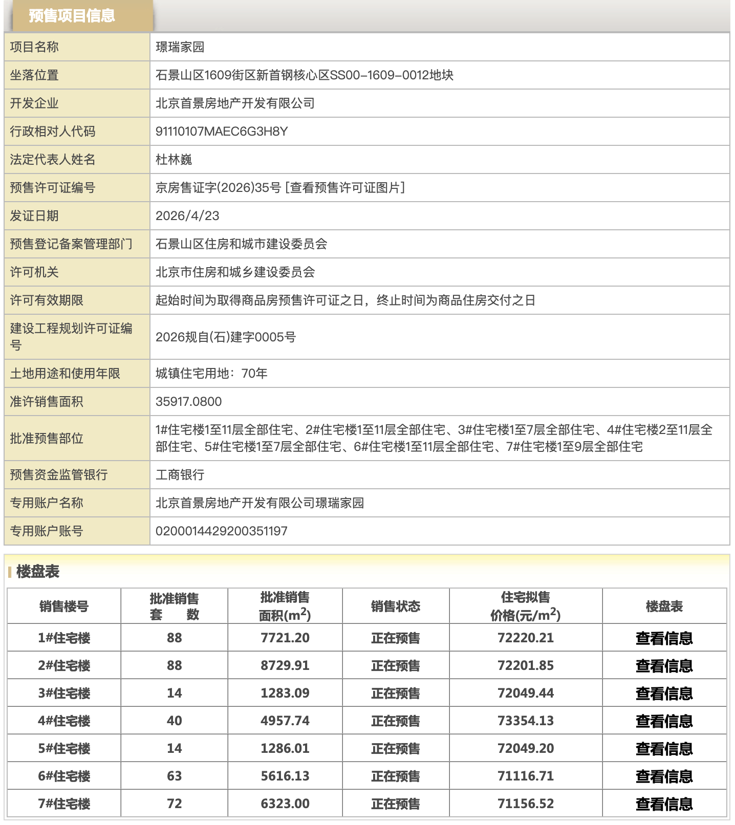 石景山首钢园区新盘“首钢璟瑞长安”于4月23日一次性取得全部房源预售许可证,共7栋洋房、379套住宅。