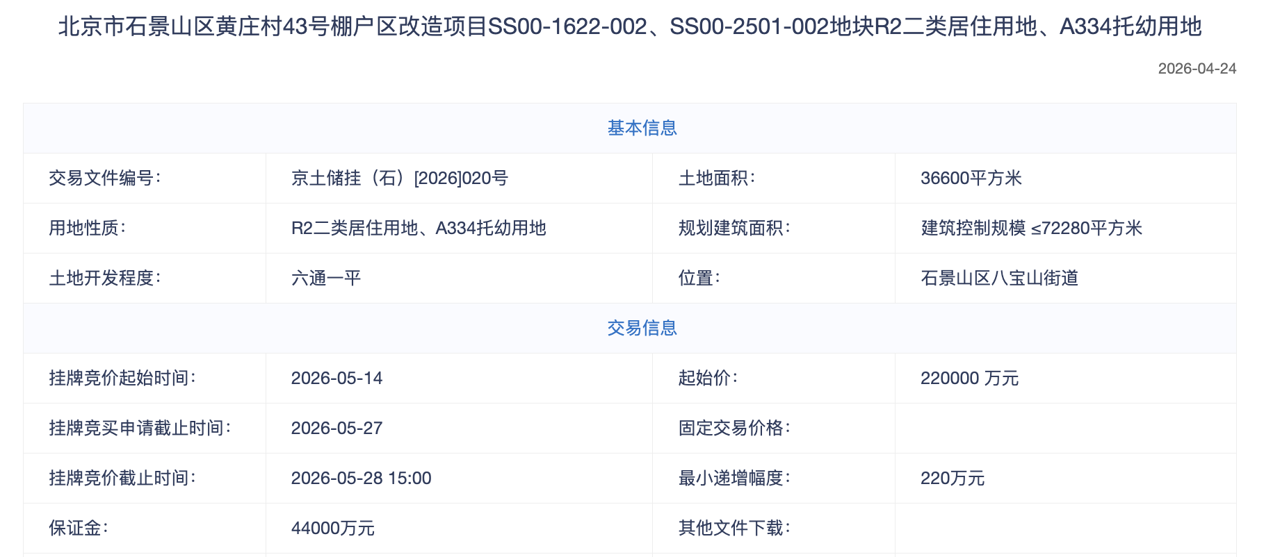 西四环边“压箱底”地块重启!石景山黄庄地块正式挂牌,起拍价22亿元,折合楼面价约3.3万元/㎡,2024年预申请价42.43亿元。