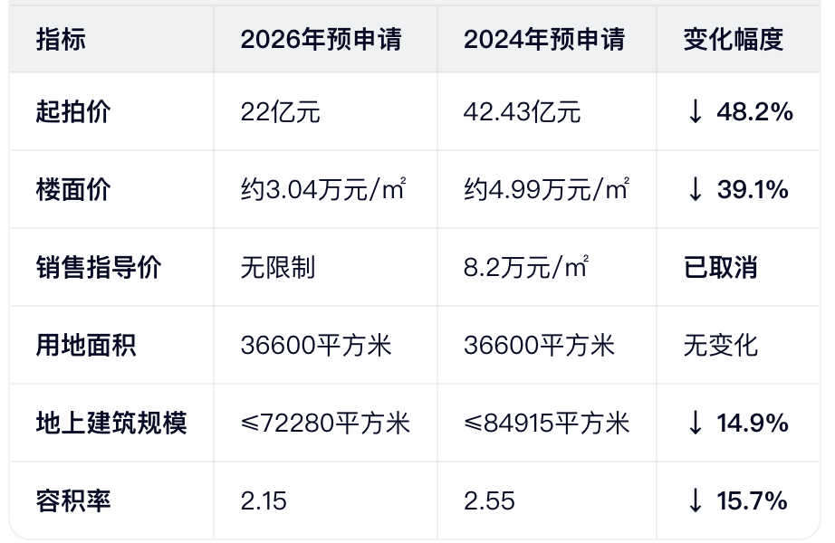 对比2024年预申请时的42.43亿元起拍价和约5万元/㎡楼面价,此次“返场”价格近乎腰斩。